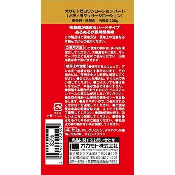 オカモトゼロワンローションのハードタイプはアナルプレイにお勧め!密着感高まる乾きにくさにこだわったアナル ローション「オカモトゼロワンローション ハード」200ml。ローションを使用する上での不満点として多く挙げられる『乾きの早さ』を解決!ヌルヌルが長時間持続する乾きにくさを追求。ブランドカラーの赤を採用したスタイリッシュなハンディボトルは、片手でスマートに使えるワンタッチキャップ設計。無香料・無着色、安心・安全な日本製です。