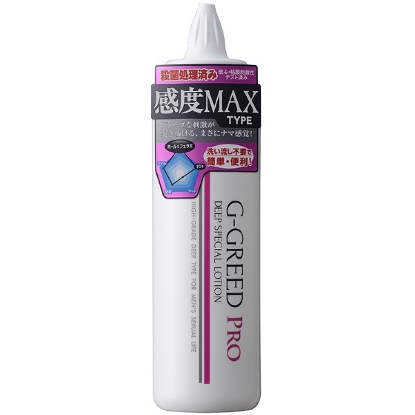 ディープな刺激が突き抜ける、まさにナマ感覚!水溶性の洗い不要ローション「G-GREED PRO(ジーグリード プロ)ディープスペシャル 300g」。まるで唾液の様な使用感でフェラ系ホールとも相性抜群!殺菌処理および皮膚・粘膜刺激性テスト済みで衛生面も安全性にも優れたスペシャルローション。回転させるとオープンする先細り型のスクリューノズルで注入もラクラク♪洗い流し不要で後処理も簡単です。