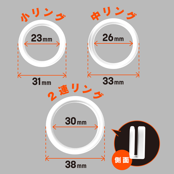 皮戻りや持続力アップなどマルチに活躍!内径23mmの小、内径26mmの中、内径30mmの2連リングに加え、好きなサイズに調整できる内径調整リングの4個セットになっているので、個人の身体に合わせてお使いいただけます。