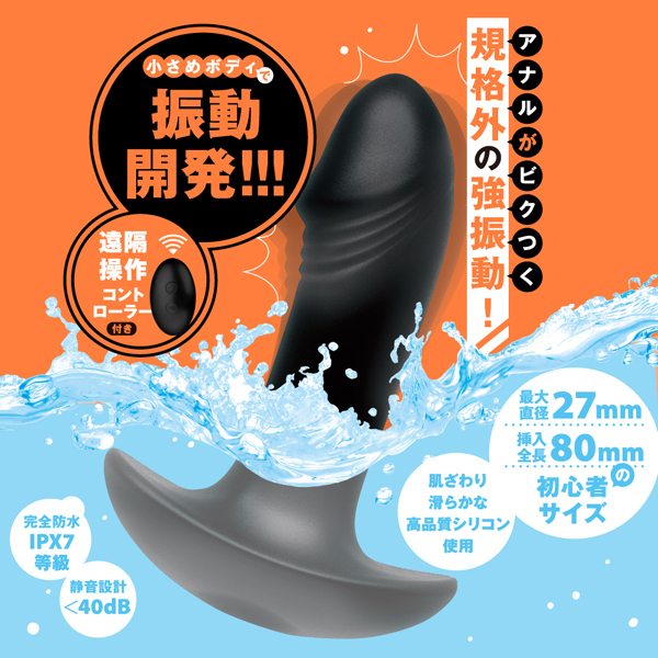 アナルがビクつくほどの強振動!小さくて高性能なお風呂で楽しめるIPX7等級の完全防水バイブ。最大幅2.7cm、挿入全長8cm、お尻に挿れるのが初めてでも安心な細身タイプ!肌触り滑らかで柔らかな高品質シリコンを採用し、先端は入れやすいリアル造形。底部にはしっかり止まるストッパー付き!9種類の振動と遠隔操作機能を搭載した高性能バイブ。USB充電ケーブル付属