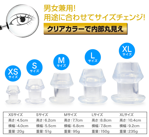 男女兼用!用途に合わせてサイズチェンジ!内部穴360度見渡せる極上の光景幅広いプレーが可能な多用途プラグ柔軟性と形状保持力を備えた透明色の拡張アイテムです。