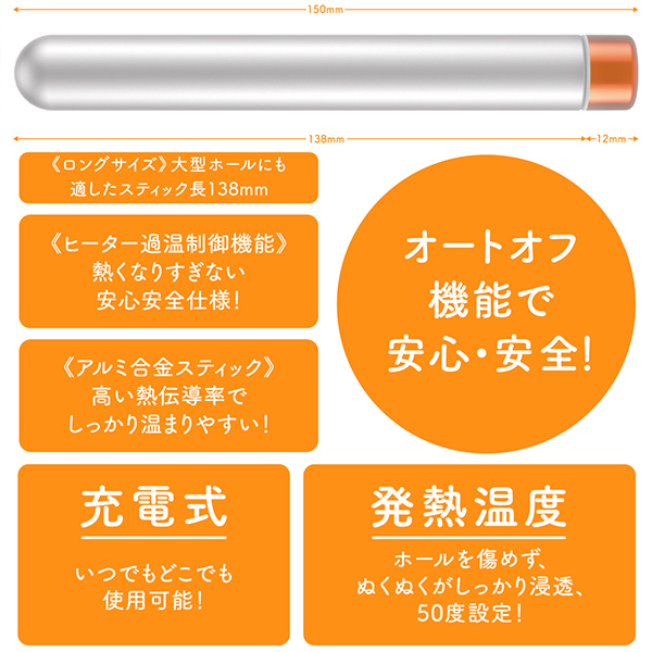 使い方は簡単でオナホに挿すだけで楽チンぬくぬくオナニー!充電式でケーブルレスだからいつでもどこでも使用可能♪ホールサイズに合わせて温め時間を15分と10分の2段階で設定可能でオートオフ機能を搭載しているから点けっぱなしの心配がありません!さらには完全防水だからホールに注入したローションも一緒に温めることができ、そのまま洗えるのでメンテナンスも楽チン♪発熱温度は50度設定!ホールを痛めることなくぬくぬくがしっかりと浸透します。