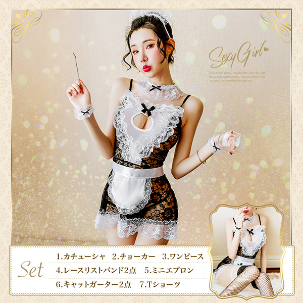 仕様 : フリーサイズ セット内容:カチューシャ、チョーカー、ワンピース、レースリストバンド×2、ミニエプロン、キャットガーター、Tバックショーツ