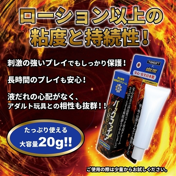 バックファイアーからア●ル専用クリームの登場です!少量の使用で長時間のプレイが可能!ローションのタイプより持続するので、乾きにくくプレイに集中できます。