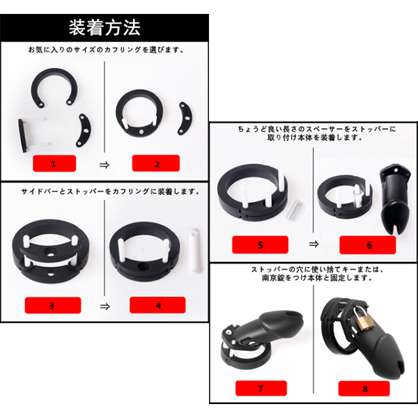 各部品を組み立てることで、あらゆるサイズに適した貞操帯が出来ます。先端に排泄口があるので装着中も排尿が出来ます。南京錠をすることで射●管理を確実に行うことが出来ます。ショート・ブラック