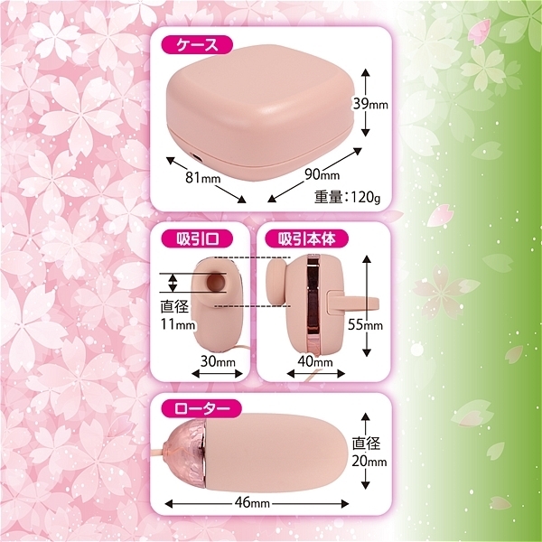仕様 : パッケージ:10.7×101×5.5cm 本体:ケース(9.0×8.1×3.9cm)、吸引(5.5×4.0×3.0cm・吸引口直径1.1cm)、ローター(4.6×2.0cm) 重量:120g