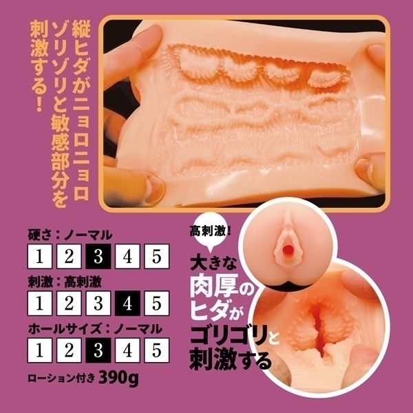 サイドは大きな肉厚のヒダがゴリゴリと、下部はゾリゾリとした縦ヒダがニョロニョロゾリゾリと敏感部分を刺激!更に本体を回転させると全く別の挿入感が味わえます!国内設計&国内製造で安心安全!