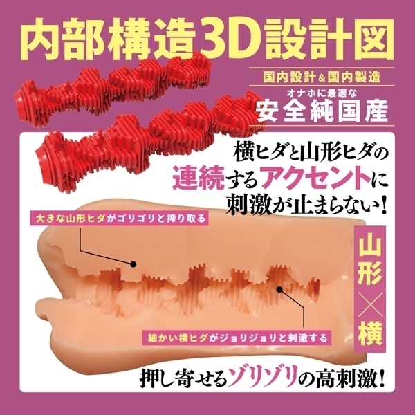 リアルな刺激を追求した非貫通型オナホールです♪重量370gの使いやすいサイズで、横ヒダと山形ヒダの連続構造が、ゾリゾリと高刺激を提供します。細かいヒダが繊細な刺激を与え、大きなヒダがしっかりと搾り取るような感覚を実現!国内設計・製造で安心の品質を誇り、安定した使い心地を楽しめます。