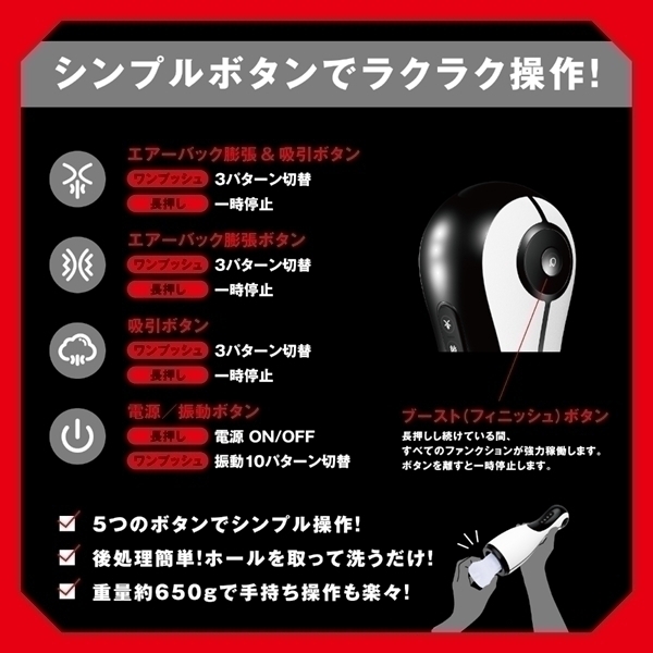リアルな使用感を追求した電動オナホールです♪両サイドのエアーバックが膨らむことで心地よいフィット感を実現し、安定した使用をサポートします!吸引パターンや振動パターンが複数用意されており、好みに応じてカスタマイズ可能♪高品質エラストマー素材を使用し、安全性と使用感を重視しています!静音設計(≦60dB)により、稼働音を気にせず集中してリラックスタイムを楽しめます♪ブーストボタンが搭載されており、必要に応じて設定を調整できるのも魅力です!エアーバックプレスや振動の多様なパターンで、快適なひとときをサポートします♪