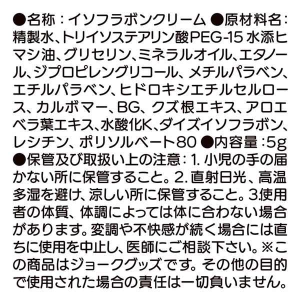 やさしく塗り込むことで繊細な部位のケアをサポートする女性用クリームです♪大豆イソフラボンやアロエエキス、ハーブ成分を配合し、しっとりとなめらかな質感が特長です!適量を手に取り、乳首まわりにやさしくなじませるだけの簡単ケア♪肌にやさしい処方で、デリケートな部位にも安心して使用できます!持ち運びしやすいサイズ感で、旅行先やリラックスタイムにもおすすめです♪使用の際は必ず相手の同意を得た上でご利用ください!ローション付きで使いやすさも◎♪日本製ならではのこだわりが詰まった、ジョークグッズとしても楽しめるアイテムです!日々のボディケアのひとつとして、おだやかな時間を演出します♪