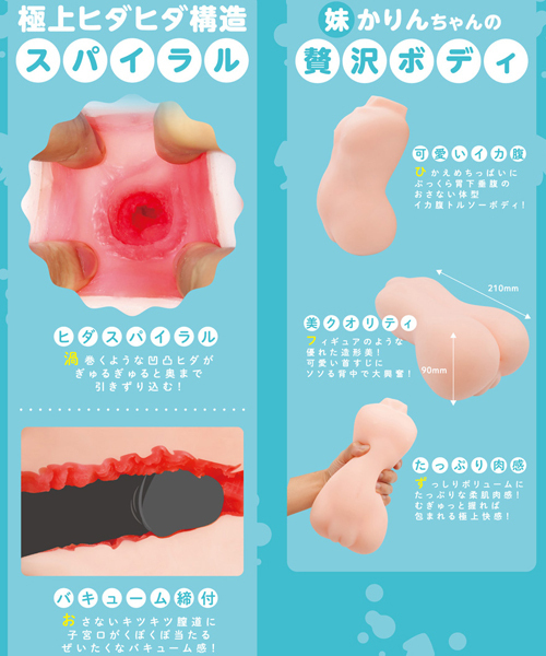 その「いかばら」をイメージさせる肉厚腹×キツ締付のオナホールです!だらしないその肉付きがとっても可愛くてたまらない!むっちりもっちりな柔肌に包まれるこの肉快感!肉厚と相性の良いキツ締め内部構造!ずっしりボリュームと搾り取れる内造形にもうヤミツキ!「妹 かりんちゃん」は、まさにタイトルそのままのようないかばらトルソーボディ!見ても良し触っても良し挿れても良しで大興奮!ひかえめちっぱいにぷっくら胃下垂腹、可愛い首筋やソソる背中と、フィギュアのような美クオリティ!重さもずっしり1050グラム!片手じゃ溢れちゃうから両手で大切に持ち上げてネ♪内部構造は最深部に子宮口もあるリアルシミュレートタイプ!渦巻くようにぎゅるぎゅる締め付け&絡み付け刺激にクポクポあたる贅沢な子宮口!スパイラルな凹凸ヒダが最深部まで導いて、おさないキツキツ膣道によるバキューム感!極上ヒダヒダ構造のスパイラル!可愛い姉妹を、たっぷり愛してね♪ミニローション付き